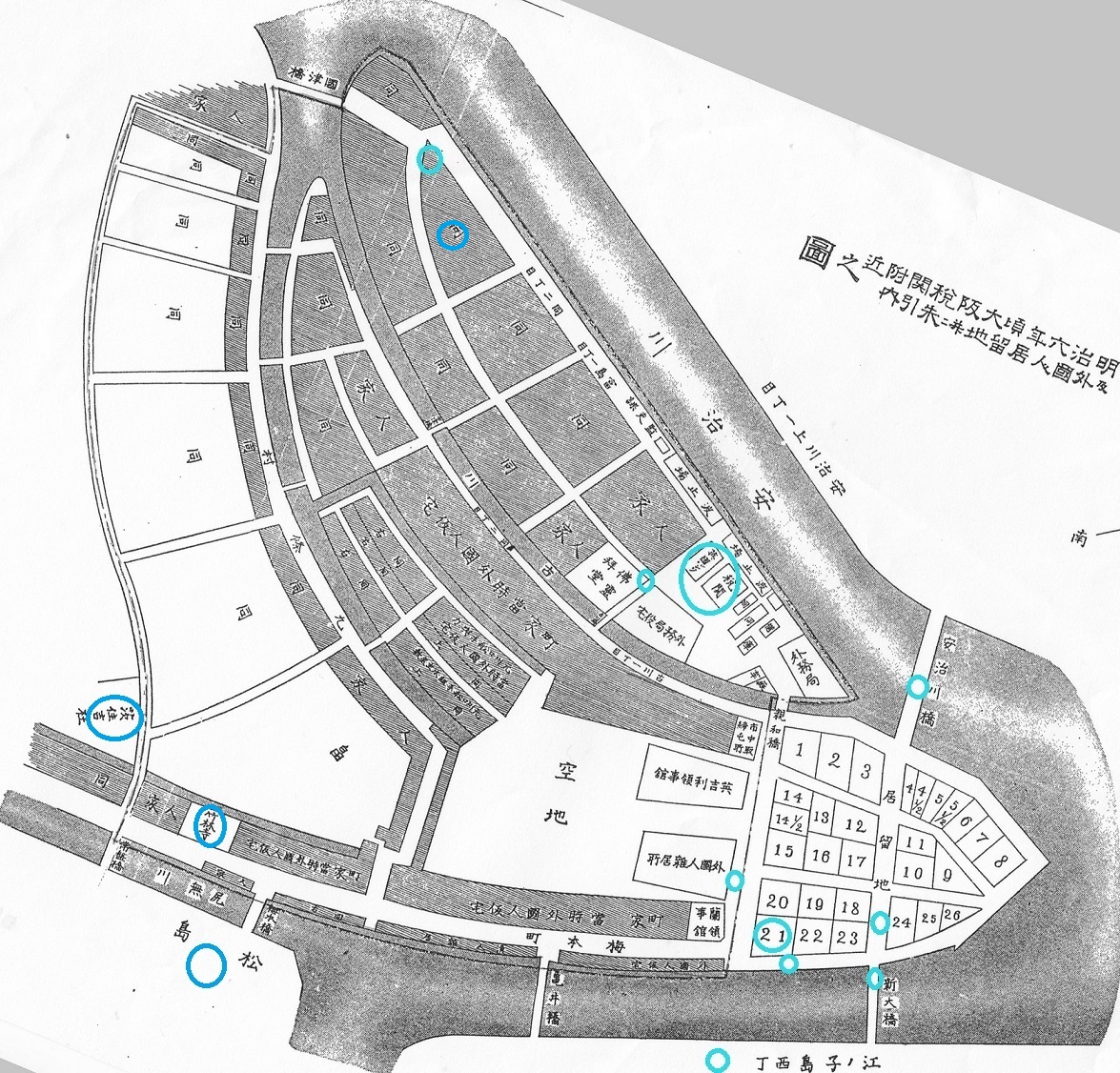 大阪税関付近及び外国人居留地並びに朱印内之図(明治6頃)